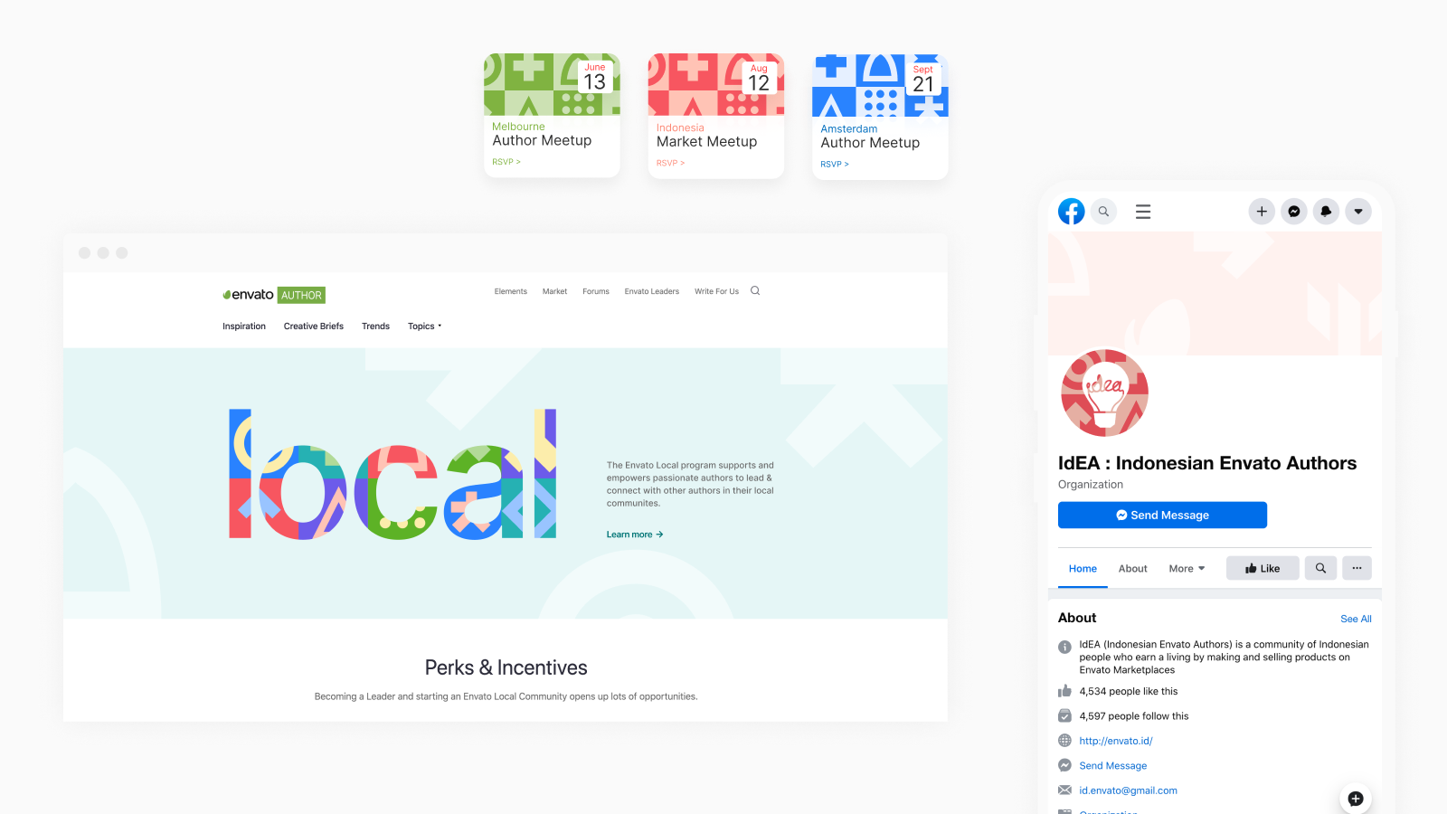 The identity direction incorporates the Envato Author logotype, giving it a sense of credibility that derives from the overarching Envato ecosystem. The vibrant colour palette draws upon Envatoโs core colour system, allowing existing Worldwide events to remain uniquely differentiated and recognisable.